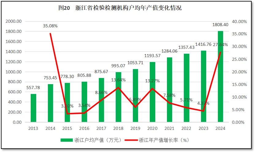 由图20可见,浙江省检验检测机构户均营业收入持续保持增长,2024年户均营业收入是2013年的3.24倍,12年来年均增长11.7%。从增长率的曲线来看,除了头两年数据误差大显得增长率很高之外,在2018年和2020年浙江省户均年产值增长率出现两个小的峰值。2021-2023年,浙江省检验检测机构户均年产值逐步走低,但2024年出现巨大反弹,户均年产值增长率达到27.64%,为2015年以来的最高值。
